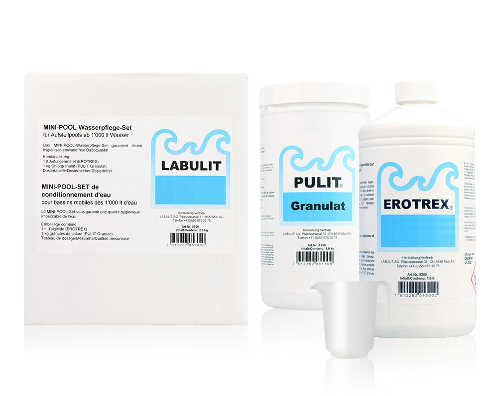 Kombipackung mit PULIT Chlorgranulat (für eine sichere Desinfektion) und einem EROTREX (zuverlässiger Algenschutz), inkl. Dosiertabelle.